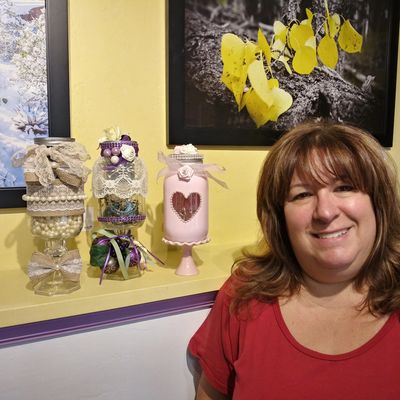 Denise Kartman will tell you she has been crafting since as long as she can remember. It is truly her passion, creative outlet and a source of joy in her life. She loves when someone enjoys her work, as it is such a compliment. Originally from the East coast, Denise has been in Phoenix since Fall 1999. Her company, All About Angels, was created back East years ago, and although the goods are not always angel related, she loves the name and kept it. Denise creates in many different forms including freestyle wire wrapped jewelry, Italian crystal earrings and home décor like wine bottle wind chimes and mason jar nightlights. We are delighted to feature Denise's beautiful and wide array of art on display at Memory Lane Trinkets and Treasures.